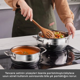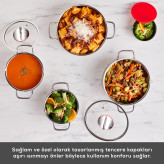 ست قابلمه استیل 10 پارچه کاراجا مدل Emirgan XL با دربهای نگهدارنده، تمام نیازهای شما در آشپزخانه را برآورده میکند. این ست کامل شامل: قابلمه 16 سانتیمتری، دو قابلمه عمیق 18 و 22 سانتیمتری، قابلمه کارنیاریک 26 سانتیمتری و ظرف نگهدارنده 12 سانتیمتری با درب میباشد. دربهای شیشهای آن امکان مشاهده فرآیند پخت غذا را فراهم میسازند. ساختار استیل ضد زنگ آن، این ست را به گزینهای سالم و بادوام تبدیل کرده است. قابلیت شستوشو در ماشین ظرفشویی، استفاده از آن را آسانتر کرده است. قابل استفاده روی تمام اجاقها، از جمله اجاقهای القایی (اینداکشن) میباشد.