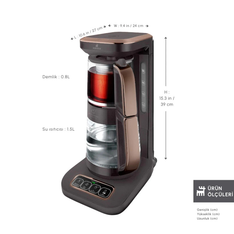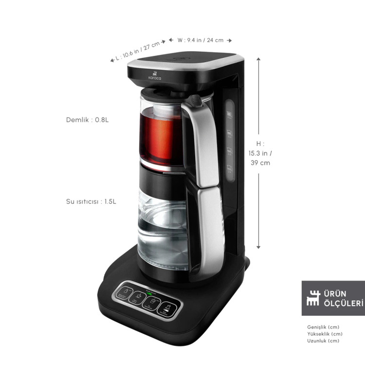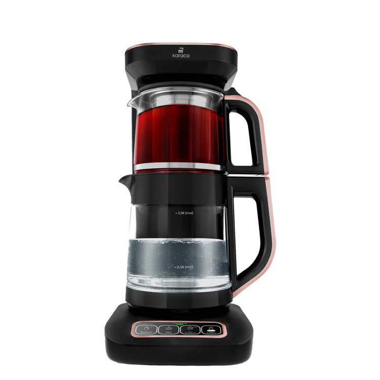 چایساز شیشهای خودکار سخنگو کاراجا مدل Çaysever Robotea Pro Connect چهار کاره با قابلیت جوشآوردن آب و دمآوری قهوه فیلتر – توان ۲۵۰۰ وات