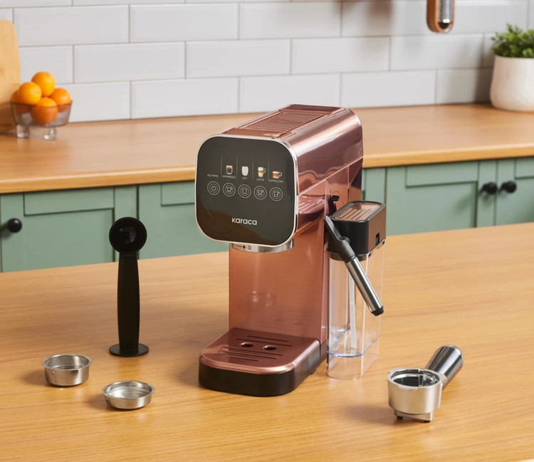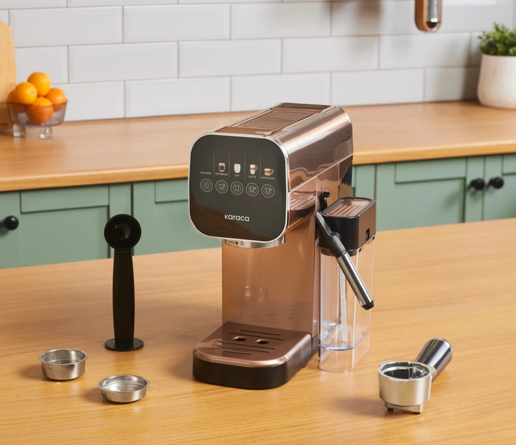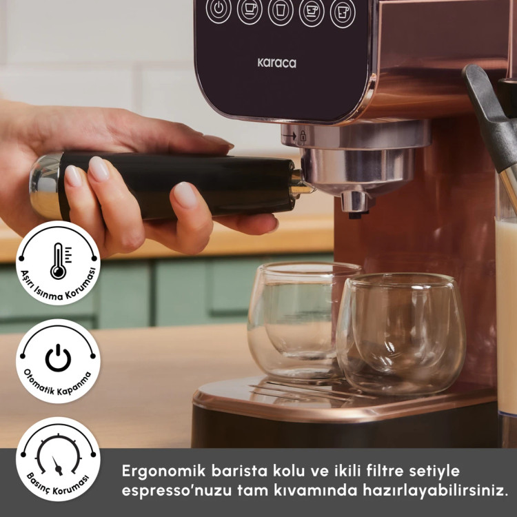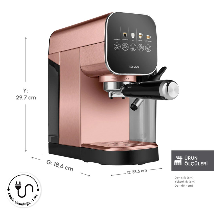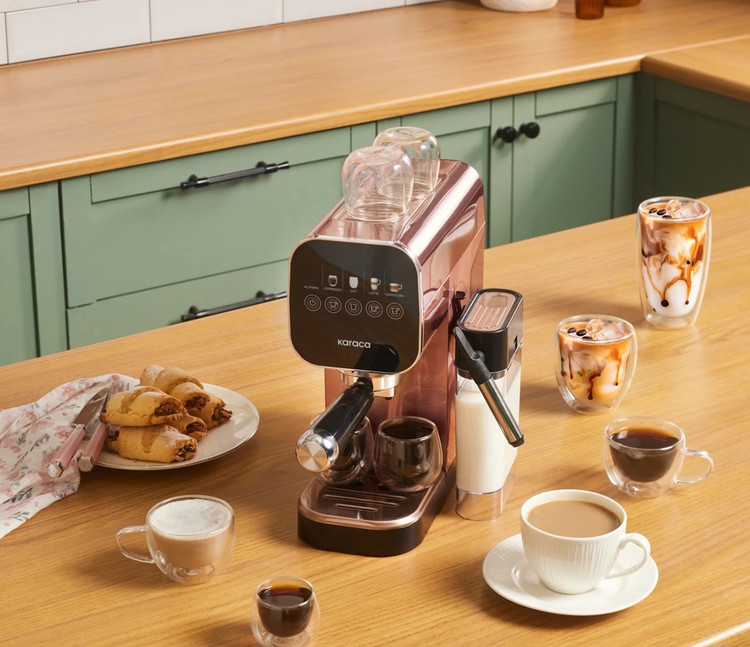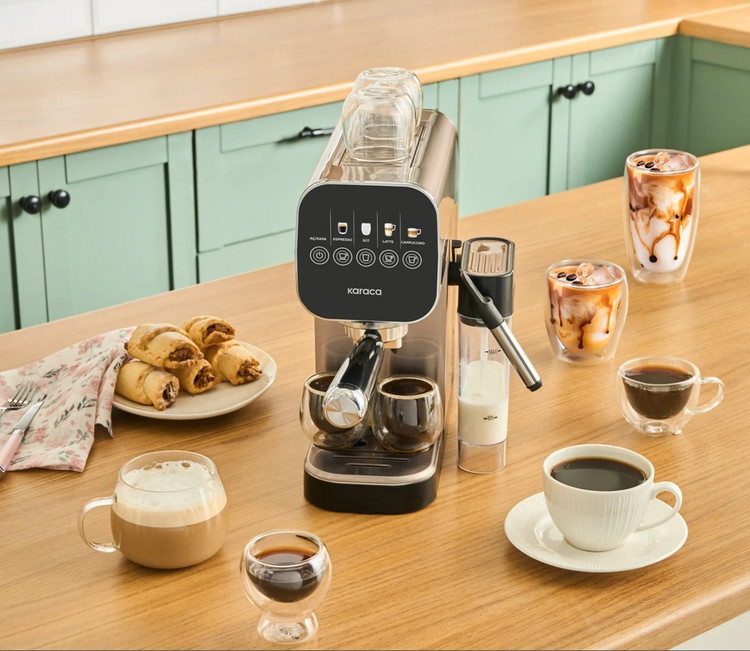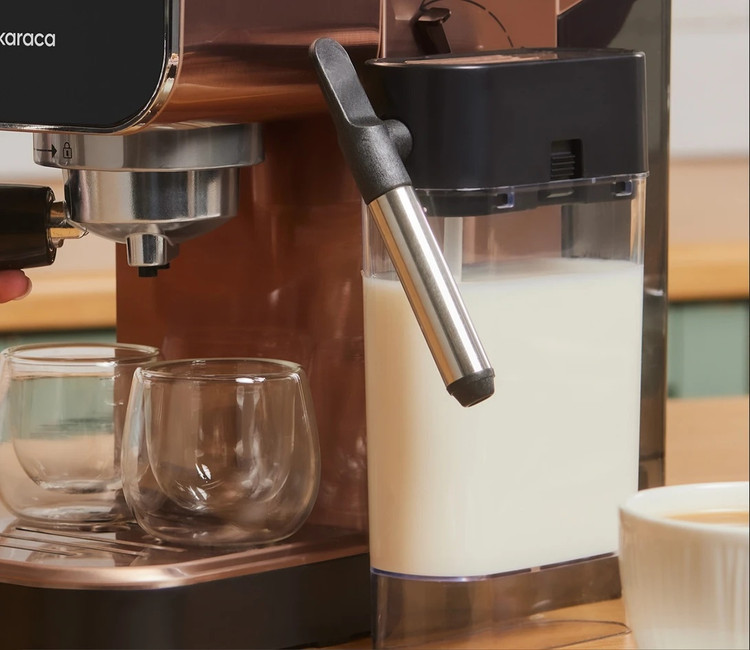 اسپرسوساز و لاتهساز تماماتوماتیک کاراجا مدل MyCaffe Barista S20 با مخزن شیر یکپارچه، رنگ مسی، دارای ظرفیت ۹۰۰ میلیلیتر و توان ۱۳۶۰ وات است. با استفاده از این دستگاه، میتوانید انواع قهوه مانند اسپرسو، لاته، کاپوچینو، آمریکانو، فلت وایت، کورتادو، ماکیاتو، لونگو، آفوگاتو، آیس لاته، آیس کاپوچینو و آیس آمریکانو را با بهترین طعم و غلظت تهیه کنید.