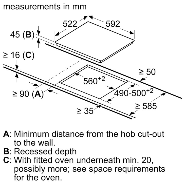 اندازه مورد نیاز برش نصب (ارتفاع × عرض × عمق): ۴۵ × ۵۶۰-۵۶۰ × ۴۹۰-۵۰۰ میلیمتر