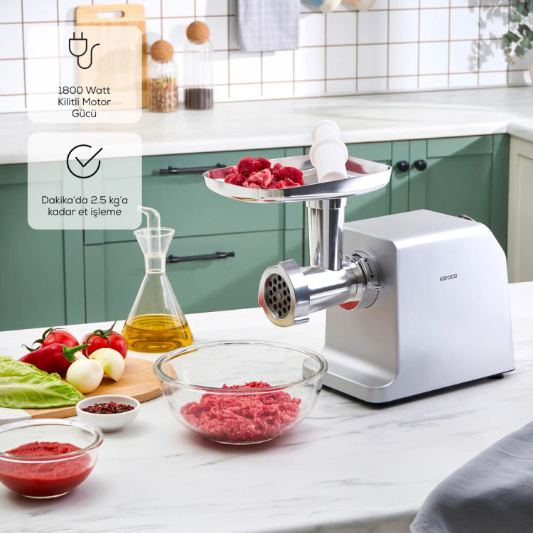 این دستگاه با موتور قدرتمند 1800 وات، توانایی چرخ کردن تا 2.5 کیلوگرم گوشت در دقیقه را دارد.