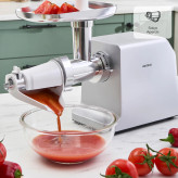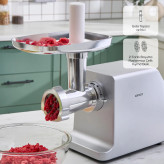 این دستگاه با موتور قدرتمند 1800 وات، توانایی چرخ کردن تا 2.5 کیلوگرم گوشت در دقیقه را دارد.