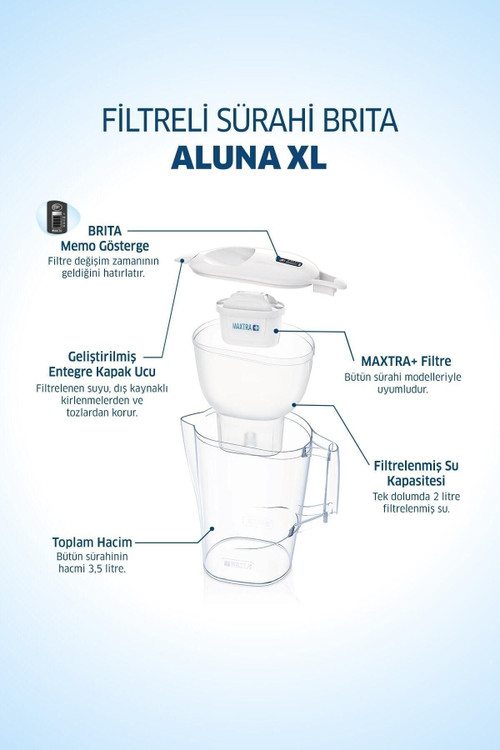 \*محتویات جعبه شامل ۱ عدد فیلتر آب BRITA MAXTRA+ و ۱ عدد پارچ تصفیه آب BRITA Aluna XL سفید با ظرفیت ۳.۵ لیتر میباشد.