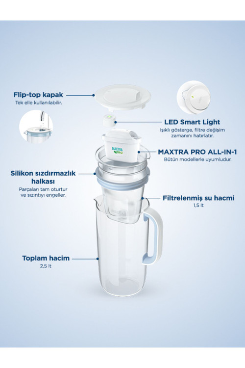 • با درپوش بالایی میتوان بهراحتی و با یک دست پارچ را پر کرد / نشانگر نوری LED BRITA Smart Light روی درپوش، با محاسبه حجم آب مصرفشده و زمان گذشته، زمان تعویض فیلتر را یادآوری میکند / تمام قطعات تا دمای ۶۰ درجه سانتیگراد قابل شستوشو در ماشین ظرفشویی هستند (بهجز نشانگر نوری Smart Light)