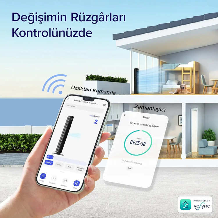 چهار گزینه کنترلی دارد: دکمههای لمسی، ریموت کنترل، اپلیکیشن و فرمان صوتی از طریق Alexa. با فناوری FlexAir، چهار حالت عملکرد و ۱۲ سطح سرعت دارد. قابلیت چرخش ۹۰ درجه و تنظیم دستی زاویه ۶۰ درجه به سمت بالا و پایین را ارائه میدهد.