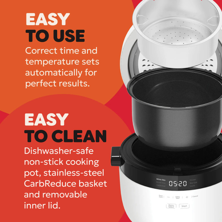 دیگ نچسب، سبد استیل ضدزنگ کاهشدهنده کربوهیدرات و درب داخلی قابل جداسازی، همگی قابل شستوشو در ماشین ظرفشویی هستند