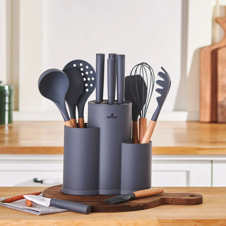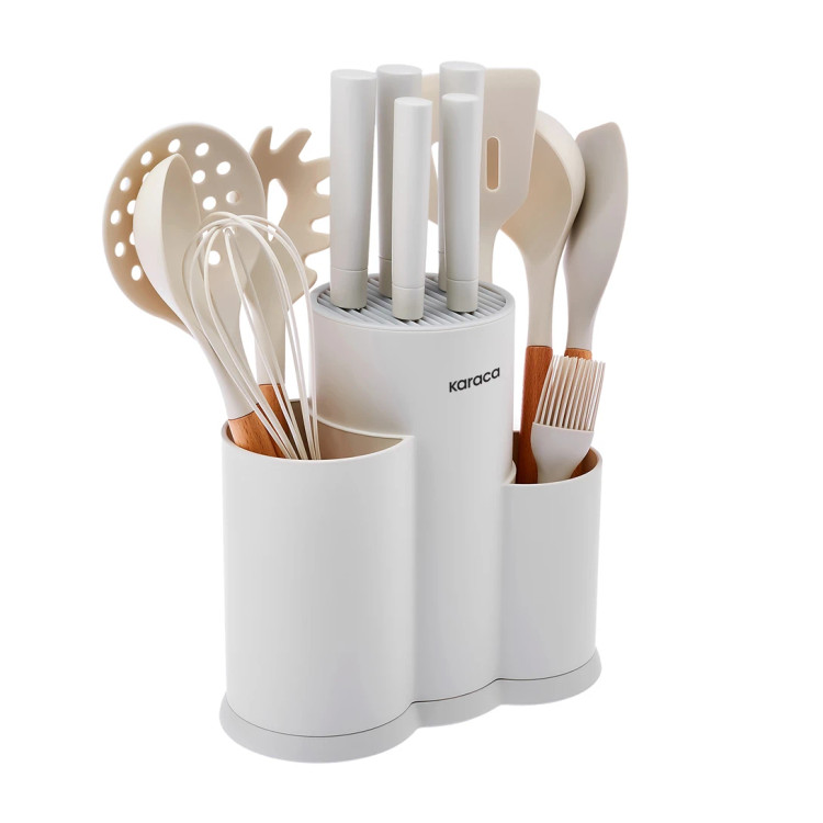 قاشق ماکارونی کمک میکند ماکارونی را بدون مشکل از قابلمه به بشقاب منتقل کنید. قاشق معمولی برای برداشتن غذاهای آبدار کاربرد دارد. صافی مخصوص برای سرو غذا هنگام آشپزی استفاده میشود. قاشق سوپخوری مناسب سرو انواع سوپ است. با همزن دستی میتوانید تخممرغ، مایه کیک و دیگر مواد را به راحتی هم بزنید. قلمموی مخصوص تخممرغ برای پخش یکنواخت مواد مایع مثل تخممرغ یا روغن روی خمیرها استفاده میشود. بلوک نگهدارنده دارای سطحی نرم و لطیف است و طراحی ارگونومیک آن، لذت آشپزی را دوچندان میکند. برای افزایش طول عمر این ست، شستوشوی دستی آن توصیه میشود.