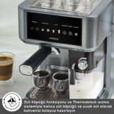سیستم کنترل لمسی، تنها با یک لمس ساده، فرآیند تهیه قهوه را در اختیار شما میگذارد. توان ۱۳۵۰ واتی و فشار ۱۵ بار دستگاه، دمای مناسب و غلظت دلخواه نوشیدنی را تضمین میکند. همچنین مخزن آب ۱.۸ لیتری، لذت نوشیدن قهوه بدون وقفه را ممکن میسازد. با صفحه گرمکن فنجان، میتوانید فنجانهای خود را پیشگرم کرده و قهوهتان را مدت بیشتری گرم نگه دارید. سیستم گرمایشی ترموبلاک نیز امکان جابجایی سریع بین تهیه قهوه و کف شیر را فراهم میسازد تا بدون انتظار، بهترین نوشیدنی را آماده کنید.
