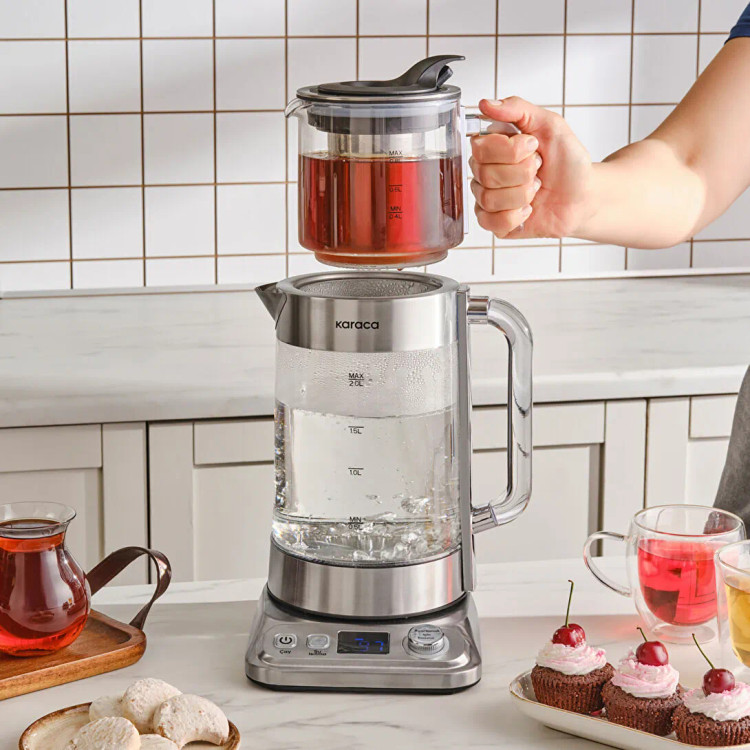 چایساز Karaca x Refika دارای درپوش ویژهای است که امکان استفاده از آن به عنوان آبجوشکن را فراهم میکند. با ویژگی «جوشاندن آب» میتوانید برای چای، قهوه و نوشیدنیهای گرم دیگر استفاده کنید.