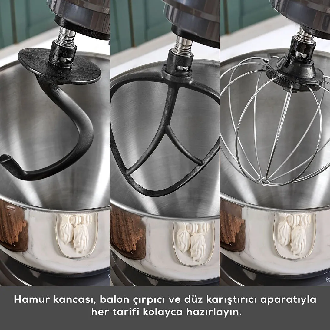 ۳ ابزار شامل قلاب خمیر، همزن صاف و همزن سیمی، که همگی قابل شستشو در ماشین ظرفشویی هستند: