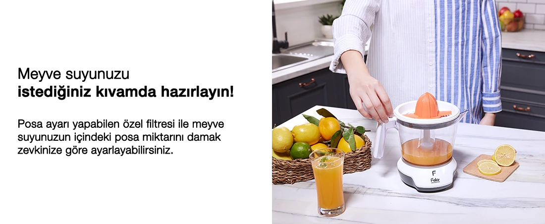 آبمرکباتگیری Fakir Press Pulp با موتور قدرتمند و طراحی مقاوم خود در هر بار استفاده عملکردی عالی ارائه میدهد با استفاده از آن میتوانید در خانه آبمیوههای تازه و طبیعی تهیه کنید دستگاه دارای دو مخروط فشاری با اندازههای متفاوت است که برای میوههای مختلف طراحی شدهاند مخروط بزرگ برای میوههایی مانند پرتقال گریپفروت و نارنج و مخروط کوچک برای لیمو لایم و نارنگی مناسب است طراحی جمعوجور دستگاه باعث میشود فضای کمی از پیشخوان آشپزخانه اشغال کند و حتی در فضاهای کوچک بهراحتی قابل نگهداری باشد