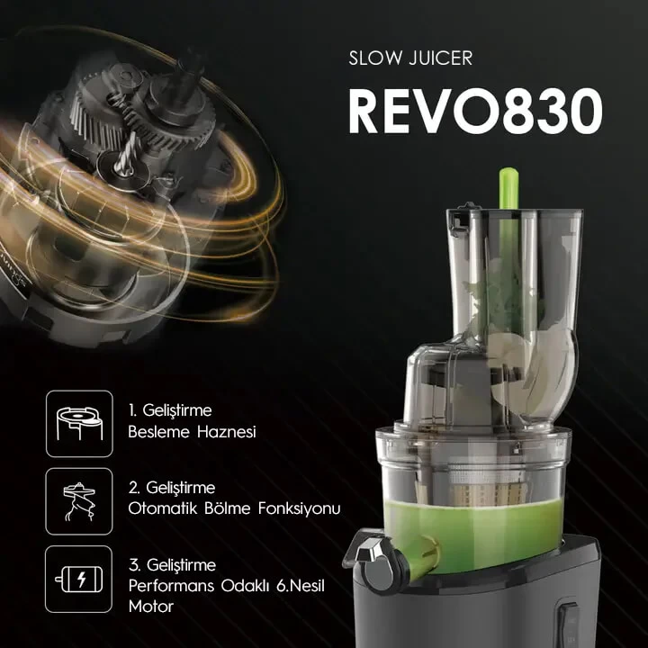 مدل REVO830 بازتعریف قدرت است. این آبمیوهگیری انقلابی یکی از قویترین موتورهای موجود در بازار را دارد. طراحی پیشرفته آن فراتر از یک آبمیوهگیری معمولی است و با ظرفیت گشتاور بالا حتی سفتترین میوهها را نیز بهراحتی آبگیری میکند.