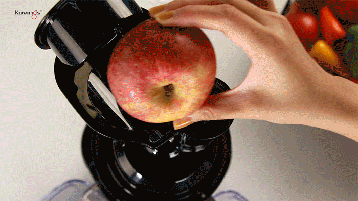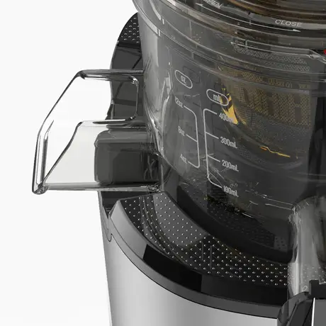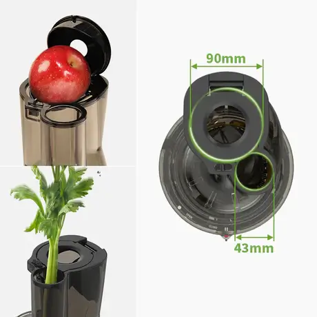 دهانه تغذیه ۹۰ میلیمتری برای میوهها و مواد غذایی گرد طراحی شده است تا بدون نیاز به برش، بهصورت کامل آبگیری شوند.