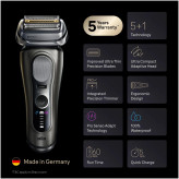 ماشین اصلاح برقی براون سری 9 PRO+ برای آقایان طراحی شده تا اصلاحی کاملاً نزدیک به پوست همراه با محافظت عالی از پوست را فراهم کند. تیغههای فوقالعاده نازک و دقیق، اصلاحی بینقص ارائه میدهند. فناوری 5+1 با هماهنگی کامل میان تیغه Direct&Cut، اصلاحکننده ProTrimmer، فویل محافظ OptiFoil، محافظ پوست SkinGuard و تیغه پوشش دادهشده با تیتانیوم ProLift کار میکند. فناوری Pro SensoAdapt تراکم ریش را 300 بار در ثانیه تحلیل کرده و به طور خودکار توان اصلاح را تنظیم میکند. این مدل همراه با مرکز SmartCare ششکاره عرضه میشود که با برنامه AutoSelect بهینهسازی شده و وظیفه تمیز کردن، محافظت از تیغه، خشککردن، شارژ و حفظ عملکرد دستگاه را بر عهده دارد. ماشین اصلاح براون سری 9 PRO+ کاملاً ضد آب بوده و در آلمان ساخته شده است.
