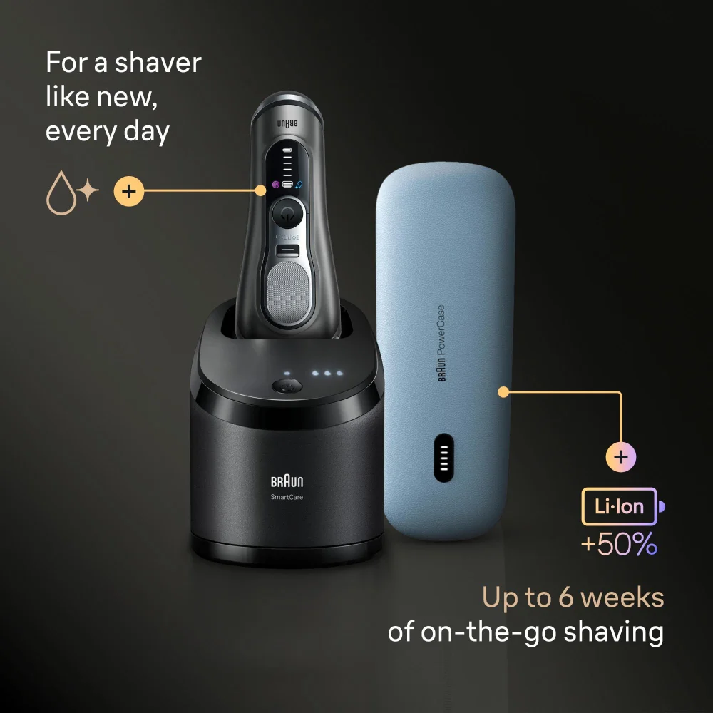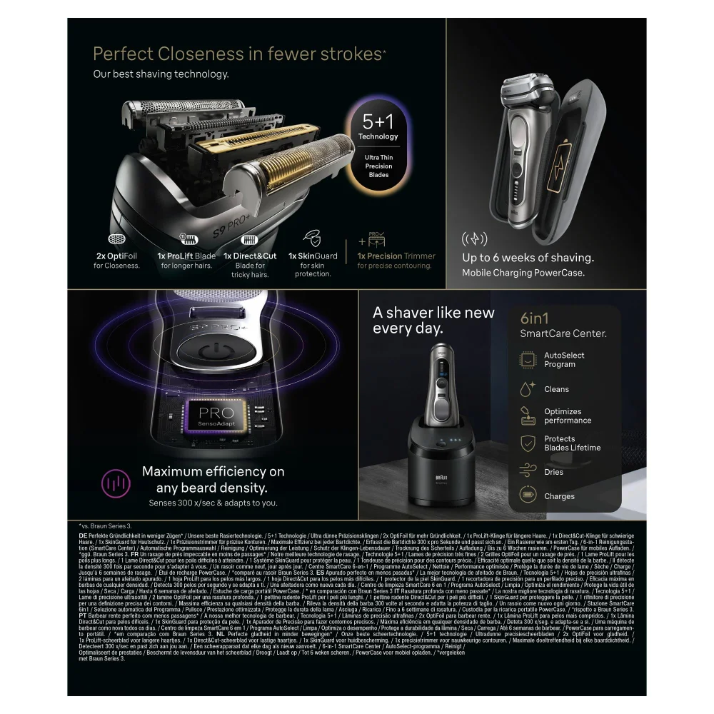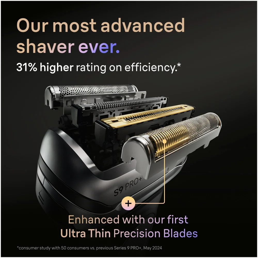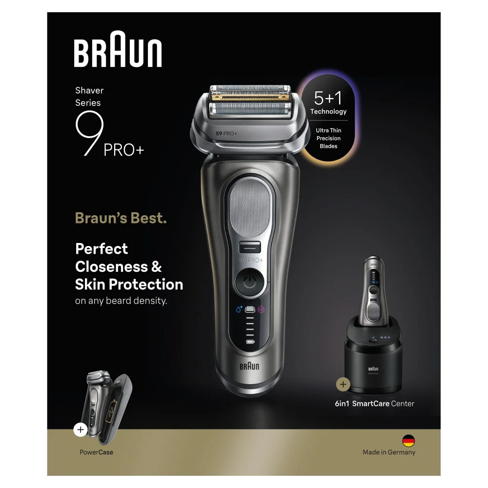 ماشین اصلاح برقی براون سری 9 PRO+ برای آقایان طراحی شده تا اصلاحی کاملاً نزدیک به پوست همراه با محافظت عالی از پوست را فراهم کند. تیغههای فوقالعاده نازک و دقیق، اصلاحی بینقص ارائه میدهند. فناوری 5+1 با هماهنگی کامل میان تیغه Direct&Cut، اصلاحکننده ProTrimmer، فویل محافظ OptiFoil، محافظ پوست SkinGuard و تیغه پوشش دادهشده با تیتانیوم ProLift کار میکند. فناوری Pro SensoAdapt تراکم ریش را 300 بار در ثانیه تحلیل کرده و به طور خودکار توان اصلاح را تنظیم میکند. این مدل همراه با مرکز SmartCare ششکاره عرضه میشود که با برنامه AutoSelect بهینهسازی شده و وظیفه تمیز کردن، محافظت از تیغه، خشککردن، شارژ و حفظ عملکرد دستگاه را بر عهده دارد. ماشین اصلاح براون سری 9 PRO+ کاملاً ضد آب بوده و در آلمان ساخته شده است.