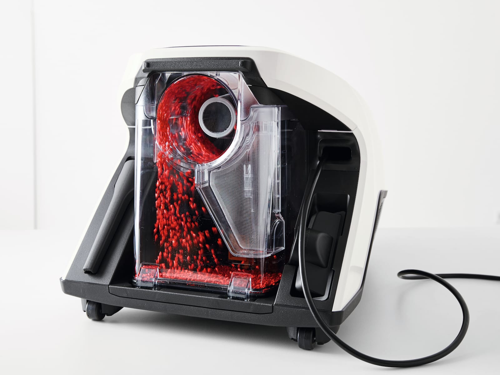 فناوری Vortex جریان هوایی با سرعت بیش از ۱۰۰ کیلومتر در ساعت ایجاد میکند. در ترکیب با سری کف مهرومومشده و طراحی آیرودینامیک جریان هوا، این جاروبرقی بدون کیسه عملکرد تمیزکنندگی درجهیکی ارائه میدهد. این فناوری باعث میشود ذرات درشت و گردوغبار ریز بهصورت بسیار کارآمد از هم جدا شوند. زبالههای درشت وارد محفظه شفاف گردوغبار میشوند، در حالی که گردوغبار ریز در محفظه جداگانهای با فیلتر مخصوص گردوغبار ریز جمعآوری میشود.