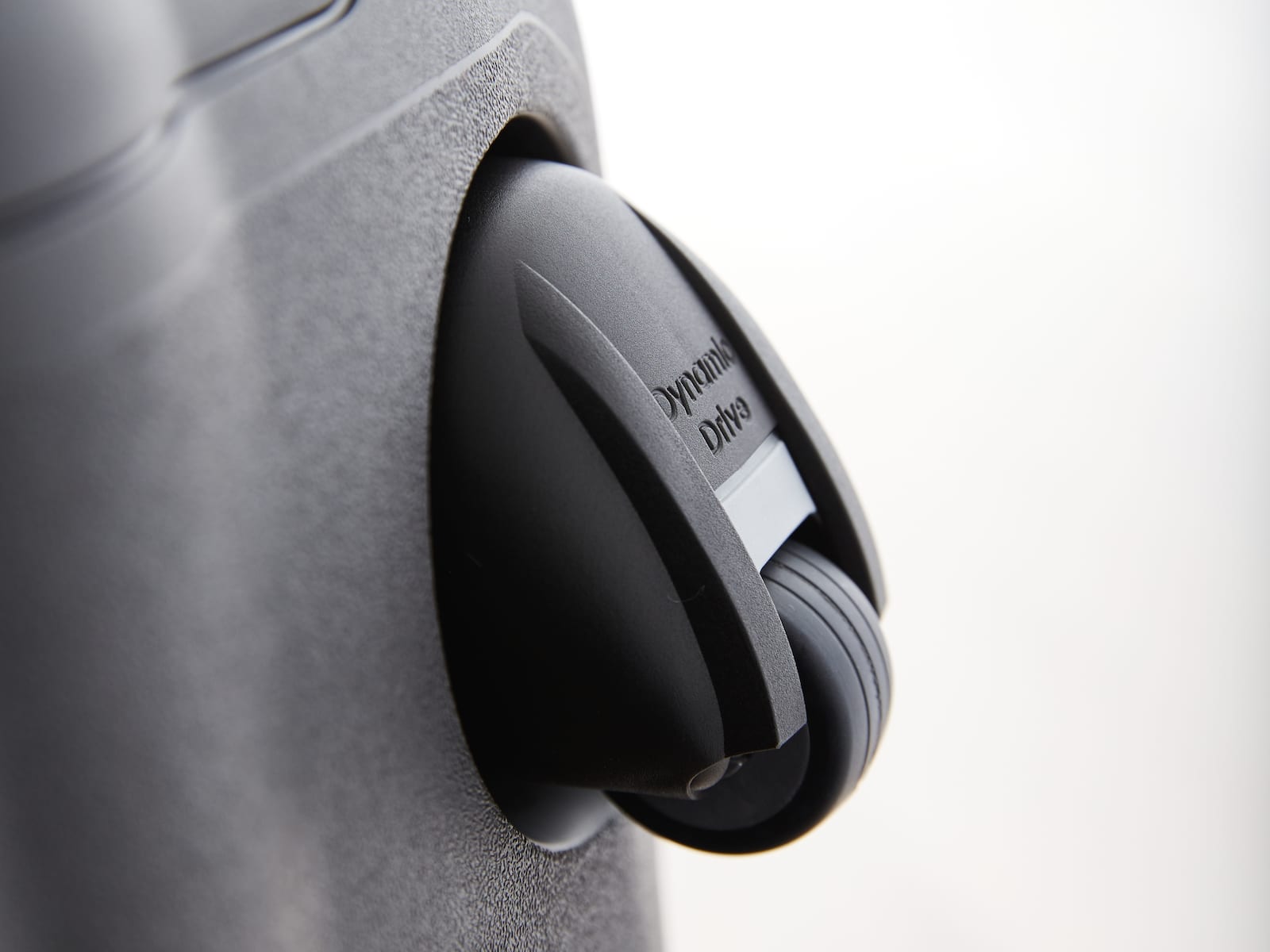 چرخهای منحصربهفرد DynamicDrive با قابلیت چرخش ۳۶۰ درجه، روی محورهای فولادی نصب شدهاند و مجهز به کمکفنر هستند. چرخهای لاستیکی به نرمی حرکت میکنند، ضد خش و بسیار بادواماند. مزیت این طراحی: جاروبرقیای بسیار چابک که در عین حال بیصدا کار میکند و به کفهای حساس به خش آسیبی نمیزند.