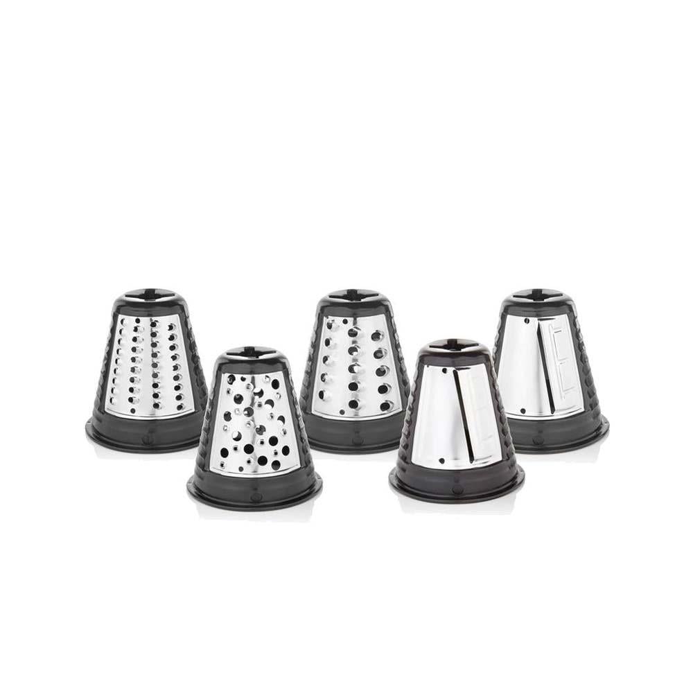 طراحی جمعوجور آن باعث میشود بهراحتی در هر آشپزخانهای جا بگیرد و در عین حال بتواند میوهها، سبزیجات و حتی مواد سختی مانند مغزها و پنیر را با سرعت بالا خرد، برش یا رنده کند. این عملکرد به لطف ۵ تیغه قابلتعویض که بهراحتی نصب میشوند، انجام میشود.