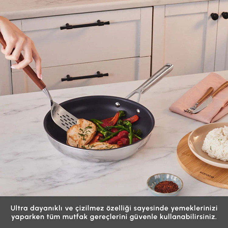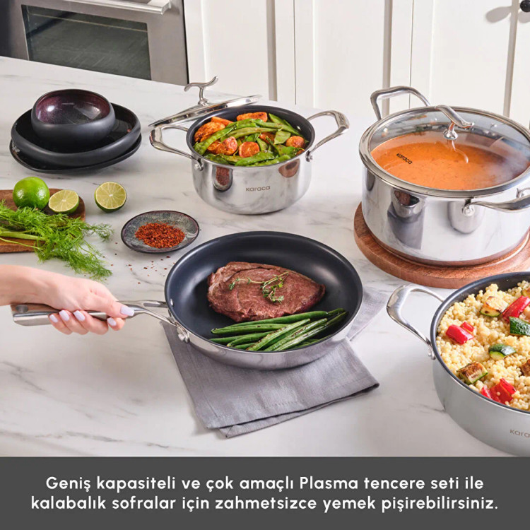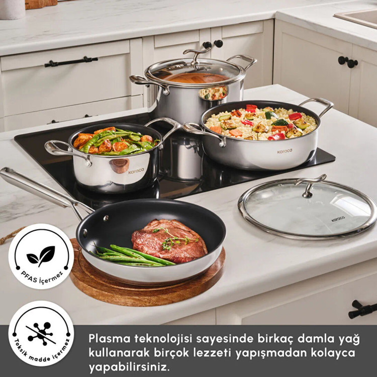 سری جدید Karaca Plasma Steel 3PLY 316+ ترکیبی از استحکام فوقالعاده استیل و خاصیت نچسب سطح پخت است.