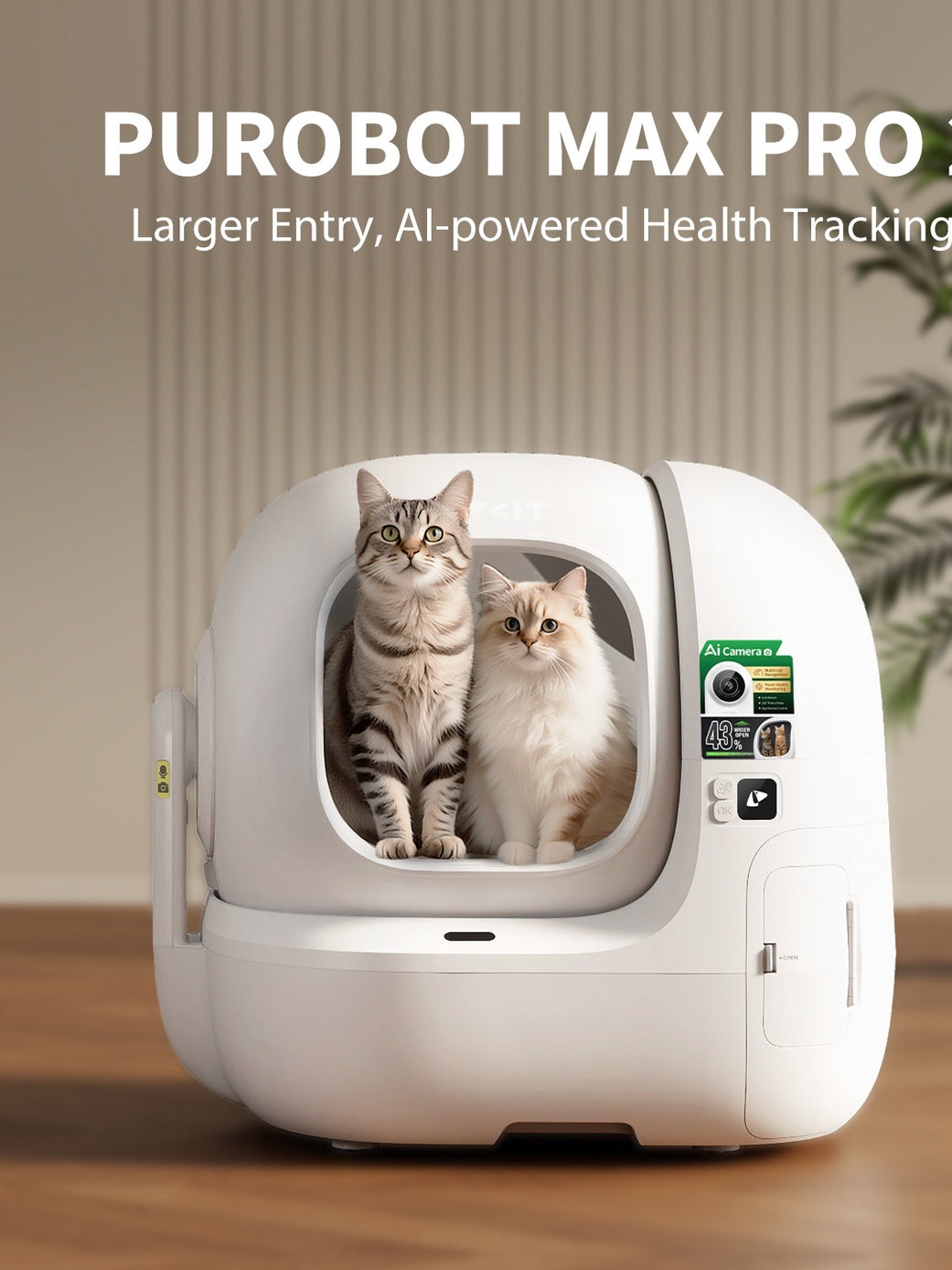 توالت هوشمند خودتمیزکننده PUROBOT MAX PRO مراقبت از خاک گربه را هوشمندتر، تمیزتر و آسانتر میکند و مناسب گربههایی با هر اندازه است. این توالت ارتقا یافته با ورودی بزرگتر برای دسترسی راحتتر طراحی شده و از دوربین مجهز به هوش مصنوعی و حسگرهای وزنی برای پایش دقیق استفاده از توالت و سلامت ادرار گربه بهره میبرد. قابلیت شناسایی چندگانه گربهها اطمینان میدهد که دادههای هر گربه بهطور جداگانه ثبت شود، که آن را برای خانوادههای دارای چند گربه ایدهآل میکند.
