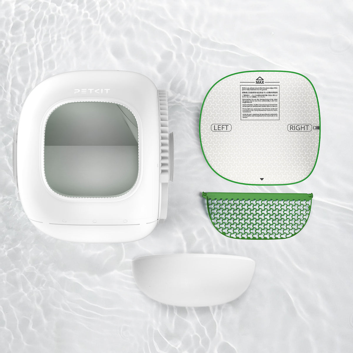 Purabot Max Pro، پد خاک گربه، کیسه زباله، دفترچه راهنما، کابل برق، استیکر رنگی، صفحه شفاف ریختن خاک