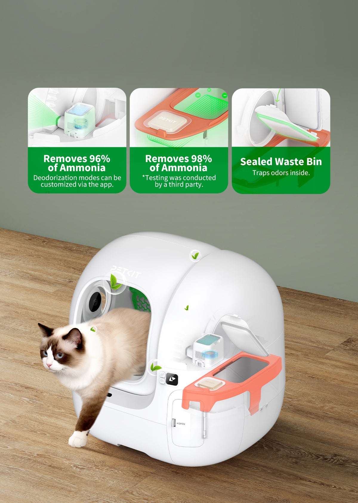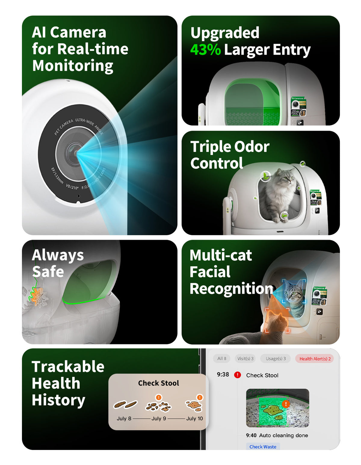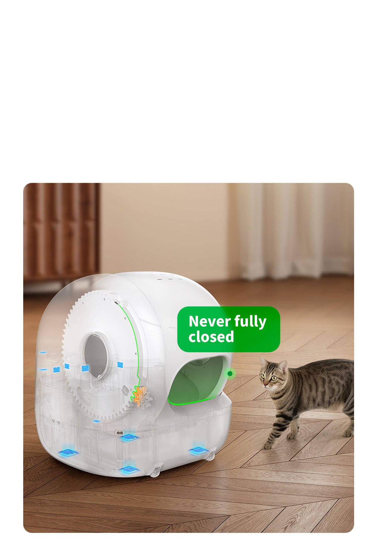 طراحی ضد گیرکردگی ثبتشده تضمین میکند که ورودی همیشه باز بماند. ۱۲ حسگر ایمنی داخلی حداکثر امنیت را در هر بار استفاده گربه از جعبه فراهم میکنند.