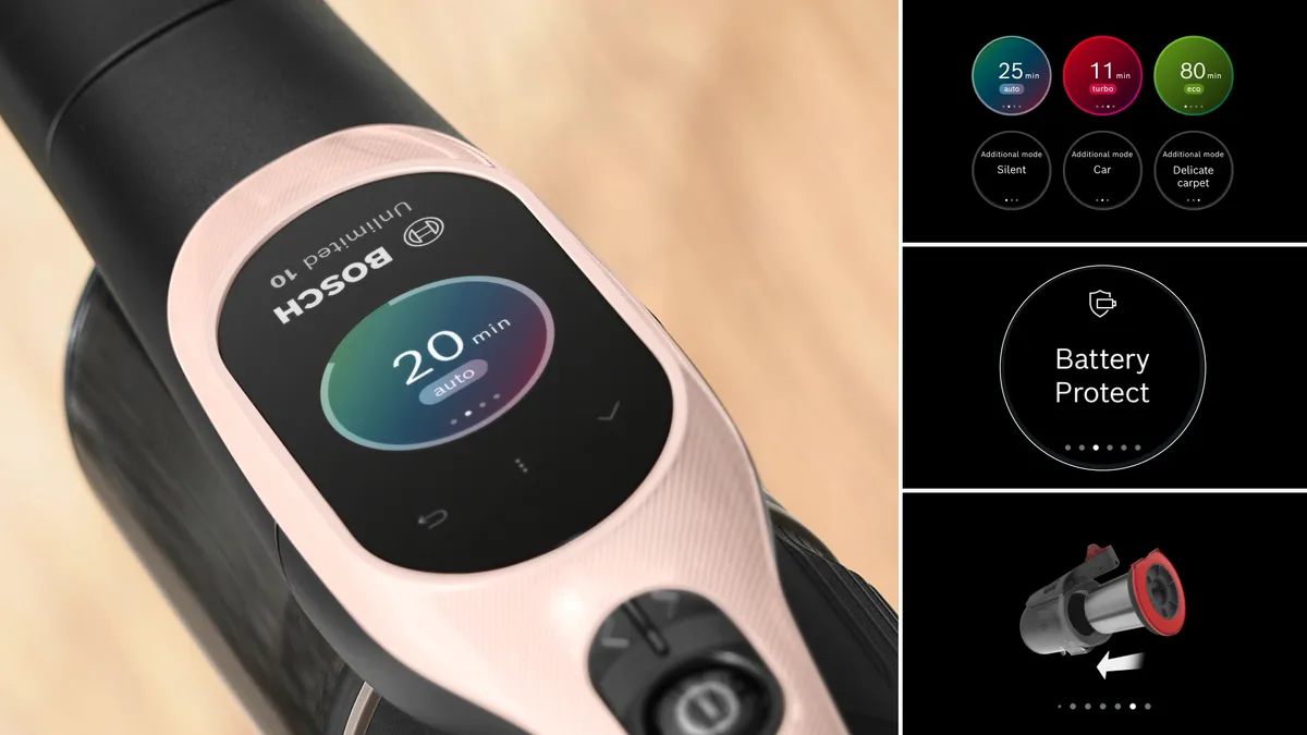 صفحهنمایش هوشمند TFT، شش حالت مختلف تمیزکاری را ارائه میدهد، مدت زمان کارکرد را نشان میدهد و دسترسی مستقیم به ویدیوهای آموزشی و راهنمای هوشمند را فراهم میکند. حالت اتوماتیک، بهصورت هوشمند با تمام سبکهای کف سازگار میشود. حالتهای تمیزکاری ویژه نیز در دسترساند: Eco، Turbo، حالت بیصدا، تمیزکاری خودرو و فرشهای حساس. با گزینه حفاظت از باتری، عمر باتری را افزایش دهید و با حالت صرفهجویی انرژی مدت کارکرد دستگاه را بیشتر کنید. Unlimited 10، قابلاعتمادترین همراه شما در تمیزکاری هوشمند است.