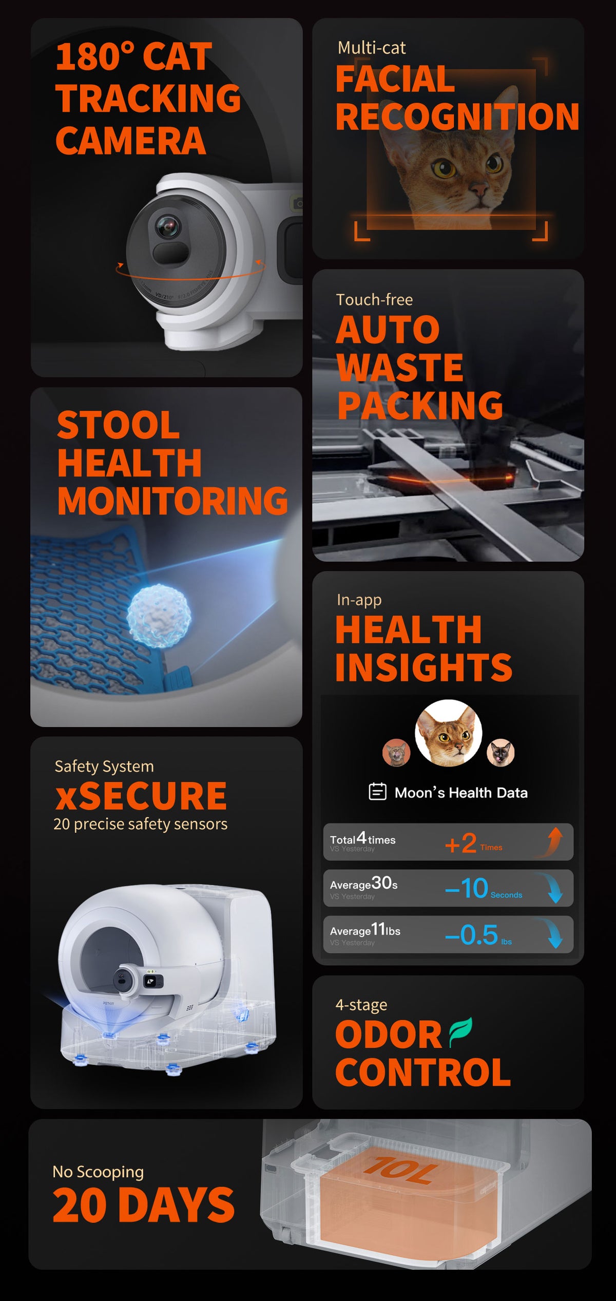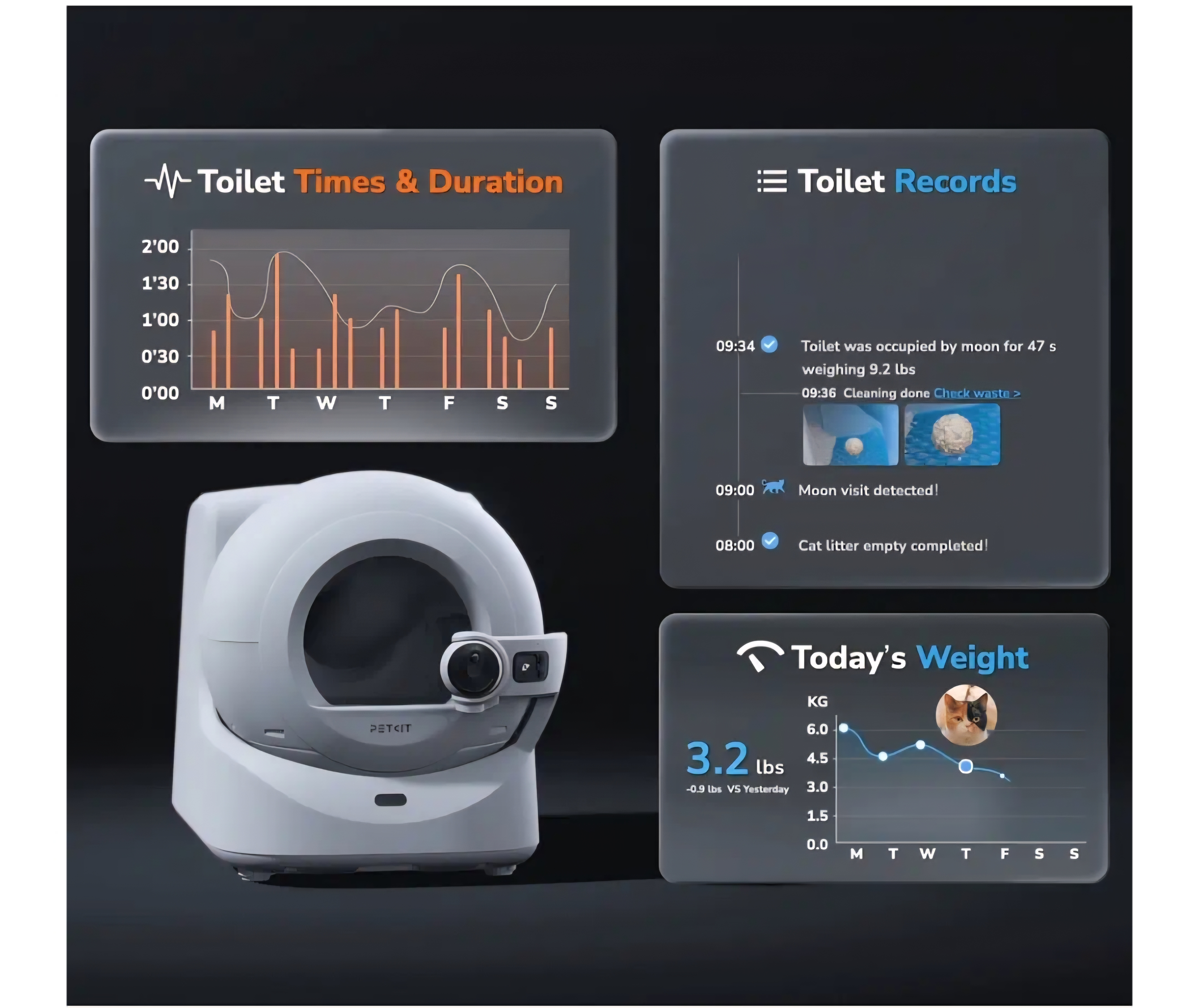 این محصول بهترین عملکرد را با شن مخصوص پایش ادرار PETKIT دارد؛ دوربین هوش مصنوعی تغییر رنگ آن را تشخیص میدهد و پیش از شدت گرفتن مشکلات، شما را نسبت به بیماریهای احتمالی ادراری مانند FLUTD آگاه میکند.