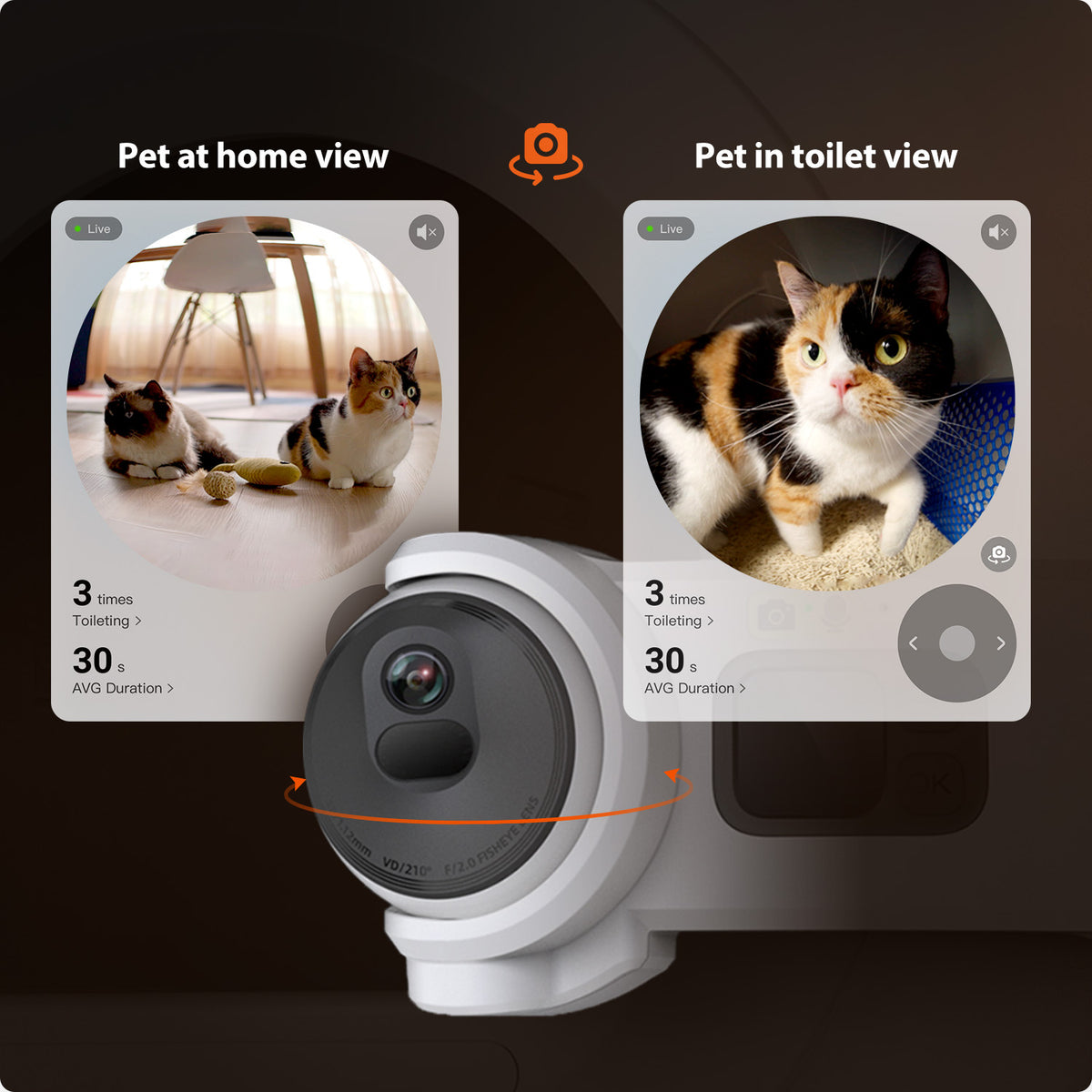 با جابهجایی بین نمای خانه و نمای جعبه دستشویی، دوربین چرخان ۱۸۰ درجه ردیابی کامل رفتار گربهها در جعبه دستشویی و وضعیت سلامت آنها در خانه را فراهم میکند.