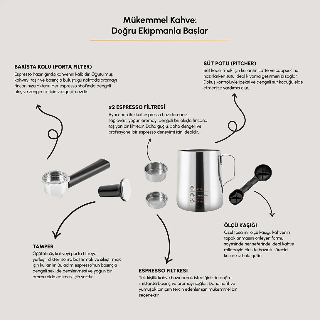 Hatır Perfetto همراه با لوازم جانبی حرفهای عرضه میشود تا در خانه، تجربه یک باریستای واقعی را داشته باشید. پورتافیلتر باریستایی، جریان حرفهای اسپرسو را فراهم میکند، پارچ شیر برای تهیه لاته و کاپوچینو بهترین کف را میسازد و تمپر، قهوه را با فشردگی ایدهآل تنظیم کرده و کیفیت اسپرسو را افزایش میدهد.