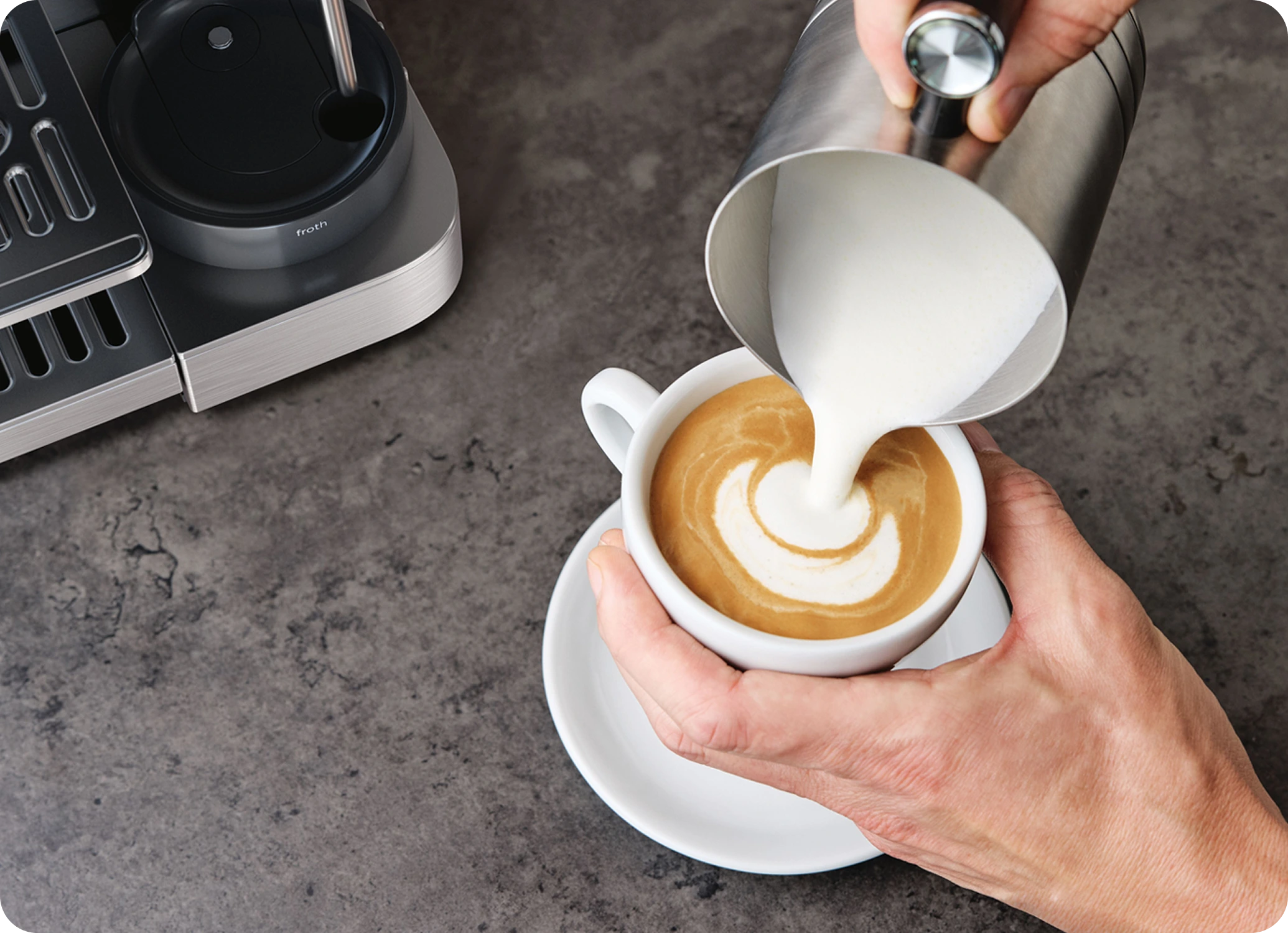 در هر فنجان، فومی مخملی و متعادل. عملکرد فومگیری با کیفیت باریستا که با نسل جدید شیرهای گیاهی سازگار است، حالا در خانه شما.