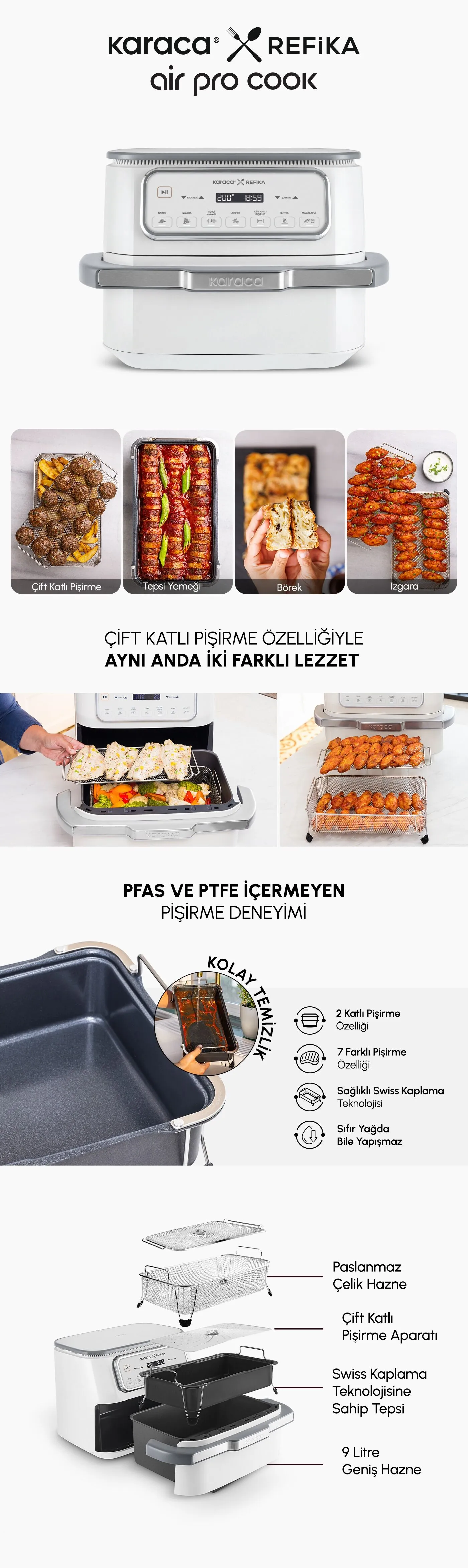 Karaca x Refika Air Pro Cook تجربهای نسل جدید از پختوپز را ارائه میدهد که چندکاره بودن، پخت سالم و کاربری آسان را در آشپزخانه شما یکجا جمع میکند. محفظه پخت با ظرفیت بالا که با فناوری پوشش سوئیسی توسعه یافته، ضمن جلوگیری از چسبندگی، حداکثر دوام را فراهم میکند و به شما امکان میدهد با خیال راحت غذاهای خود را آماده کنید.