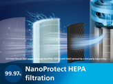 تنها دستگاههای تصفیه هوای فیلیپس دارای فیلتر **NanoProtect HEPA** با کربن فعال و پیشفیلتر هستند که ۹۹.۹۷٪ از ذرات ریز تا اندازه ۰.۰۰۳ میکرون را از بین میبرد. این فناوری نهتنها آلایندهها را به دام میاندازد، بلکه با استفاده از بار الکتروستاتیک آنها را جذب کرده و با بهرهوری انرژی بالاتر، هوا را تا ۲ برابر بیشتر از فیلترهای سنتی HEPA H13 تصفیه میکند.