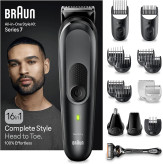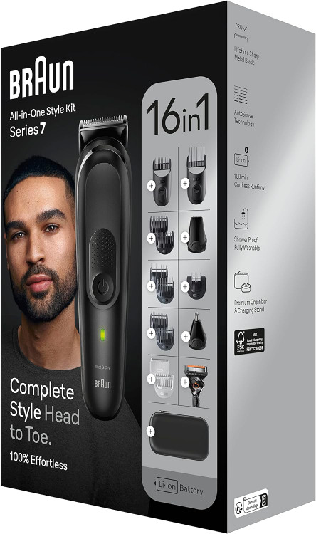 با کیت اصلاح همهکاره براون سری 7 از سر تا پا خود را اصلاح کنید. این کیت مراقبت شامل ابزارهای لازم برای اصلاح ریش، مو، جزئیات ظریف و آراستن بدن است. مجهز به تیغه فلزی فوقالعاده تیز، فناوری AutoSense و 100 دقیقه کارکرد مداوم.