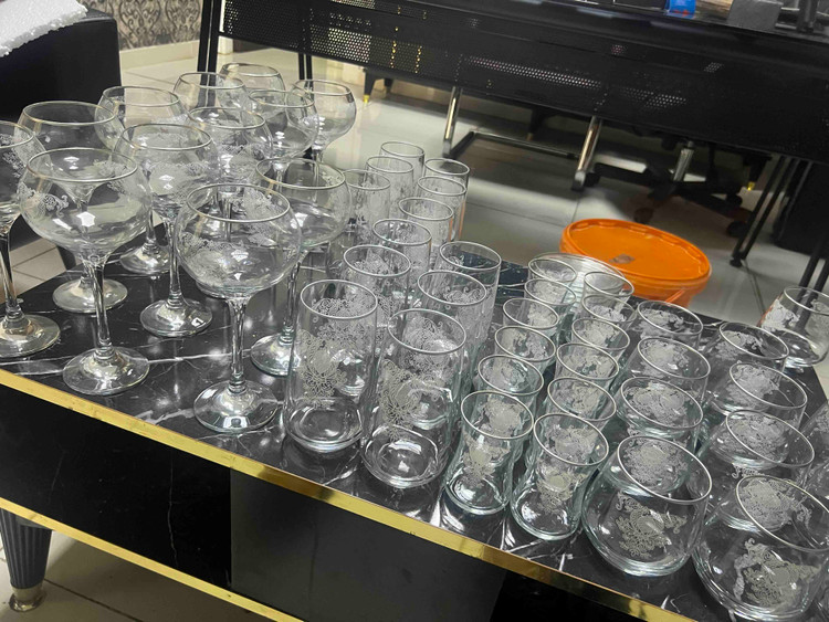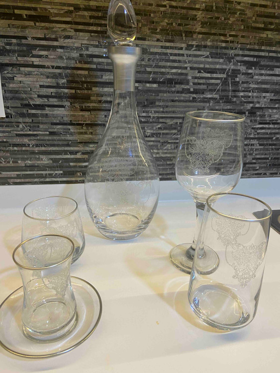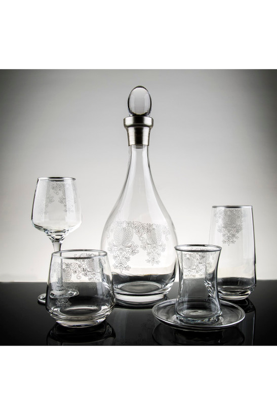 ۱۲ عدد گیلاس پایه دار / ۱۲ عدد لیوان بلند / ۱۲ عدد لیوان کوتاه / ۱۲ عدد استکان چای خوری / ۱۲ عدد نعلبکی استکان چای خوری / یک عدد تُنگ ( پارچ ) به همراه درب پوش