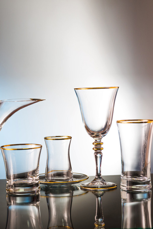 ۱۲ عدد لیوان گیلاس پایه دار / ۱۲ عدد لیوان بلند / ۱۲ عدد لیوان کوتاه / ۱۲ عدد استکان چای خوری / ۱۲ عدد نعلبکی استکان چای خوری / یک عدد تُنگ ( پارچ ) به همراه درب پوش