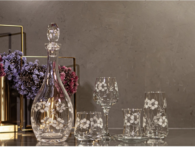 ۱۲ عدد لیوان گیلاس پایه دار / ۱۲ عدد لیوان بلند / ۱۲ عدد لیوان کوتاه / ۱۲ عدد استکان چای خوری / ۱۲ عدد نعلبکی استکان چای خوری / یک عدد تُنگ ( پارچ ) به همراه درب پوش