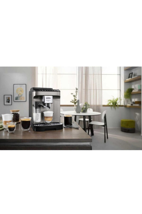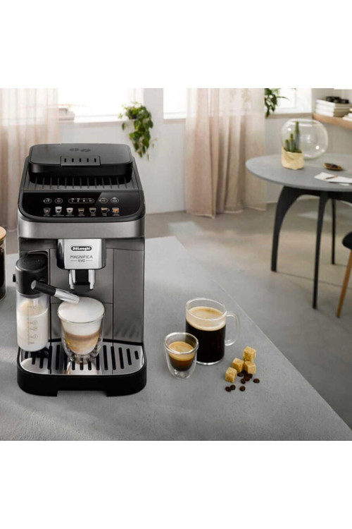 اسپرسو ساز دلونگی مدل Magnifica Evo ECAM290.81.TB یک اسپرسوساز تمام اتوماتیک است که میتواند انواع نوشیدنیهای قهوهای مانند اسپرسو، کاپوچینو، لاته، ماکیاتو و… را با کیفیتی عالی برای شما آماده کند. آسیاب داخلی این دستگاه با 14 حالت مختلف، امکان تنظیم درجهٔ آسیاب قهوه را مطابق با سلیقهٔ شما فراهم میکند. سیستم گرمکن فنجان و تنظیم غلظت و میزان قهوه از دیگر قابلیتهای این اسپرسوساز هستند.