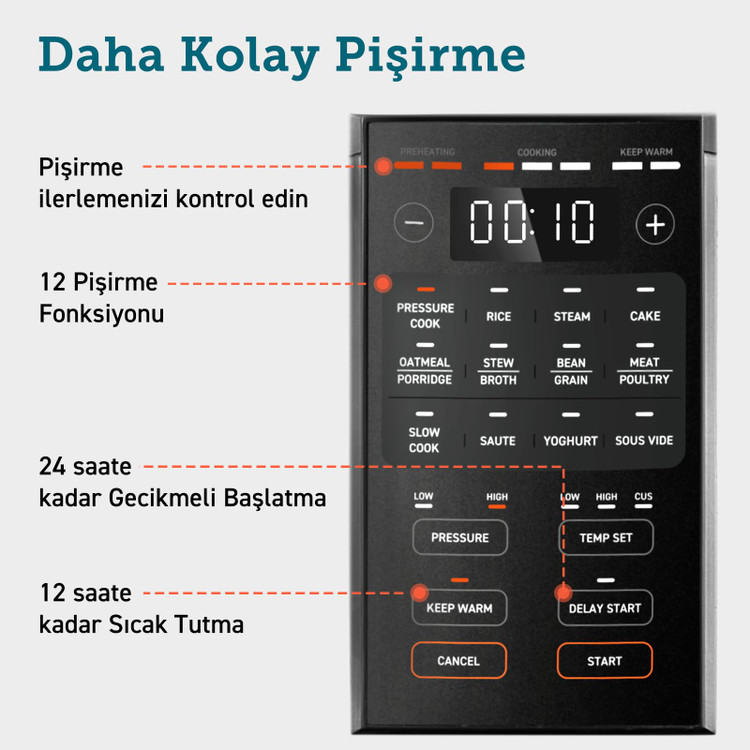 13 عملکرد پخت: طبخ تحت فشار، برنج، بخارپز، استریل کردن، بلغور جو دوسر/فرنی، خورش/آبگوشت، لوبیا/غلات، گوشت/مرغ، پخت آهسته، تفت دادن، تخمیر، سوسیس، گرم نگه داشتن تنظیمات قابل تنظیم: تنظیمات را برای هر عملکرد برای نتایج شخصی سازی شده با لمس یک دکمه سفارشی و ذخیره کنید. نوار پیشرفت در زمان واقعی: با یک نوار پیشرفت روی نمایشگر، غذاها را در یک نگاه کنترل کنید. وعده های غذایی سریع: غذاهای تحت فشار تا 70 درصد سریعتر از روش های پخت سنتی پخت و پز. تهویه بدون استرس: آزادسازی بخار بصری با خروج بخار با زاویه 30 درجه به سمت عقب که با بسته شدن درب به طور خودکار بازنشانی میشود، هواگیری را آسان میکند. ایمن برای استفاده: زودپز با درب ضد جوش دولایه و محافظ گرمای بیش از حد برای ایمن نگه داشتن پخت و پز طراحی شده است. درب قابل جابجایی: برای پخت راحت درب قابلمه را می توان به طور کامل برداشت و به صورت عمودی در پشت قابلمه نگهداری کرد. تمیز کردن آسان: فولاد ضد زنگ، محفظه مقاوم در برابر اثر انگشت، و لوازم جانبی قابل شستشو در ماشین ظرفشویی، تمیز کردن را ساده می کند.