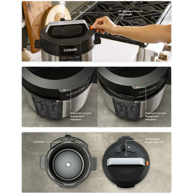 اول ایمنی: دکمه Seal/Vent دور از دریچه تخلیه بخار قرار دارد، در حالی که طراحی خروج بخار با زاویه 30 درجه به سمت عقب، تهویه ایمن و آسان را تضمین می کند. اجاق گاز دارای درب ضد جوش دولایه و محافظت در برابر گرمای بیش از حد برای ایمنی بیشتر است