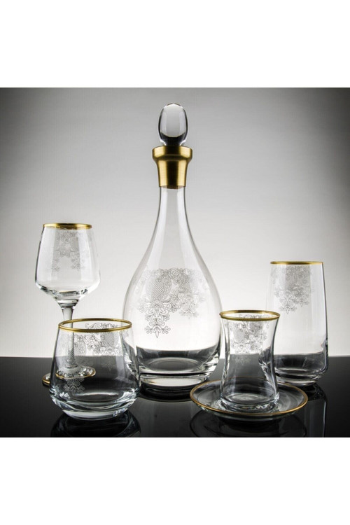 ۱۲ عدد گیلاس پایه دار / ۱۲ عدد لیوان بلند / ۱۲ عدد لیوان کوتاه / ۱۲ عدد استکان چای خوری / ۱۲ عدد نعلبکی استکان چای خوری / یک عدد تُنگ ( پارچ ) به همراه درب پوش