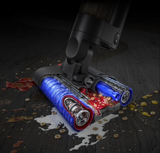 دستگاه Dyson WashG1™ به جای استفاده از قدرت مکش جارو، دارای برسهای استوانهای موتور دار با چرخش معکوس است. به همین دلیل میتواند کثیفیهای جامد را از مایعات جدا کند.