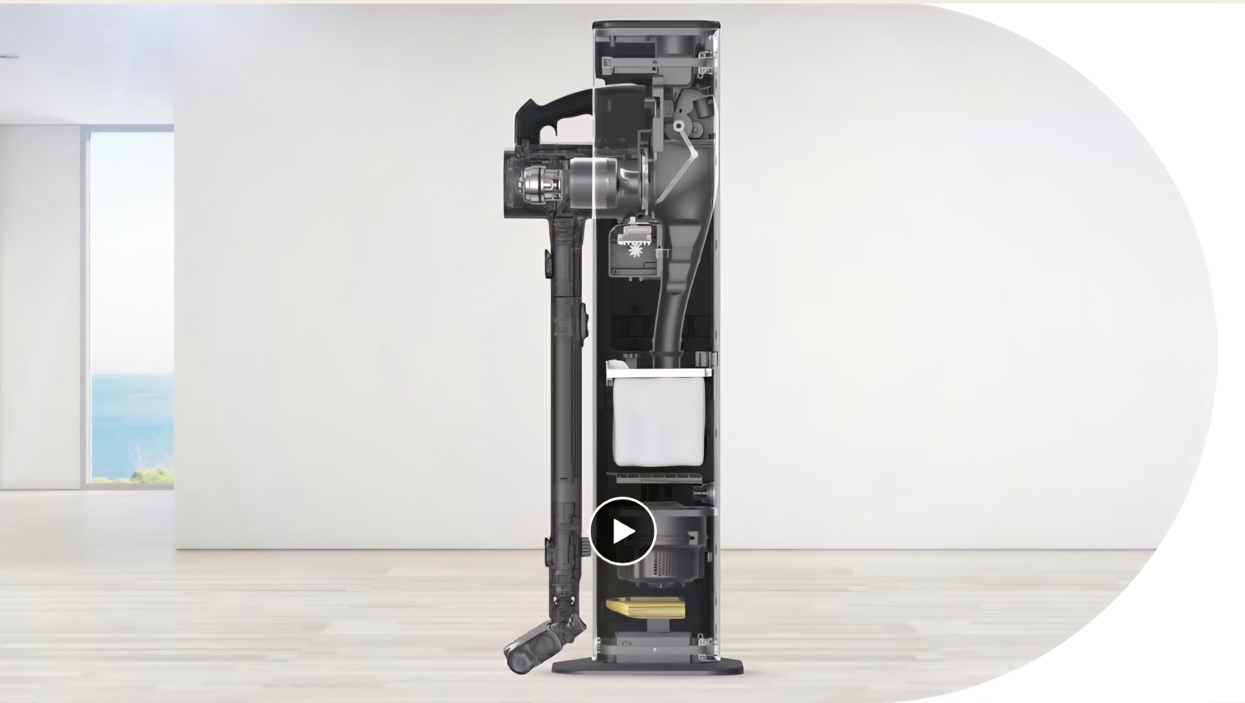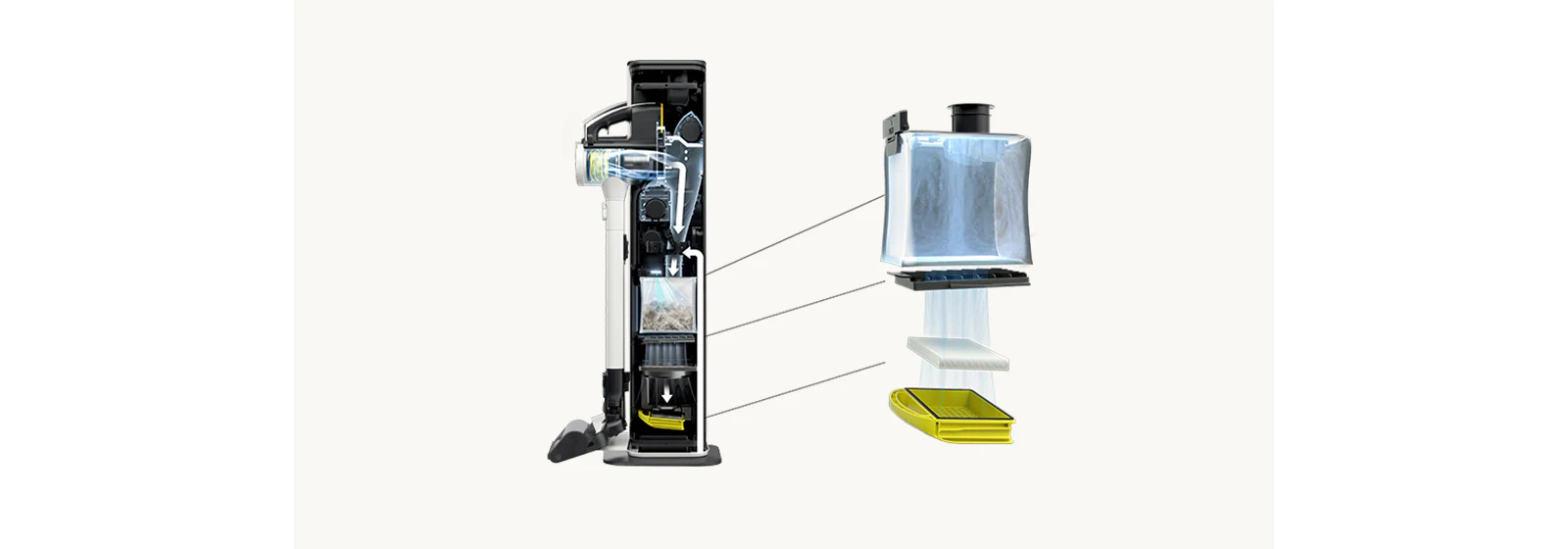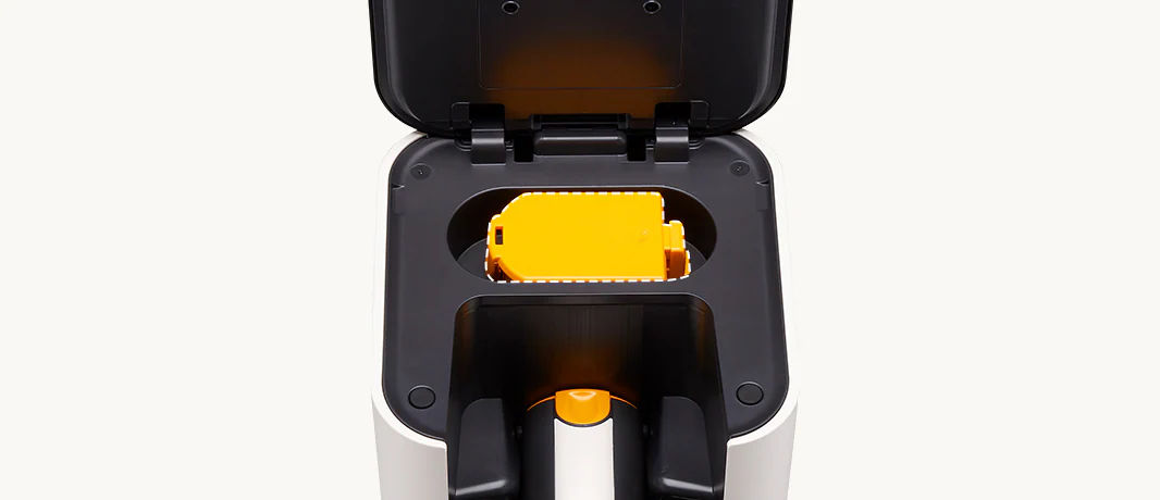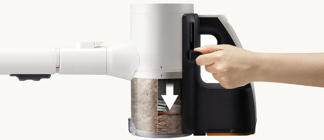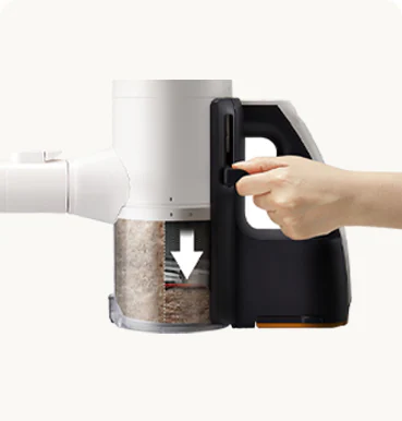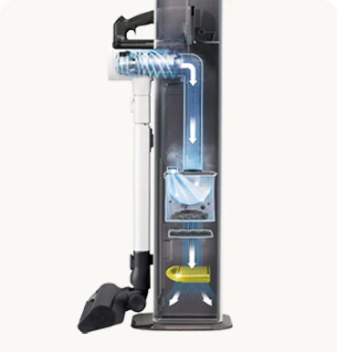 برای صرفهجویی در زمان و جلوگیری از ایجاد «ابرهای گرد و غبار» هنگام تخلیه دستی، کافیست پس از استفاده، جارو را روی برج قرار دهید تا مخزن بهصورت خودکار تخلیه شود.