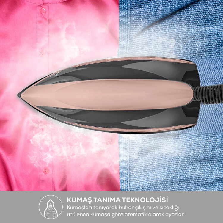 - فناوری **Smart Touch** که بدون نیاز به تنظیم دما، **برای همه پارچههای قابل اتو** دمای مناسب را بهطور خودکار اعمال میکند. از ابریشم تا پنبه، میتوانید بدون نگرانی از سوختن یا برق افتادن پارچه، آنها را اتو کنید. دستگاه هنگام روشن شدن، بهطور خودکار در این حالت قرار میگیرد و در صورت عدم تغییر تنظیمات، در همان حالت باقی میماند.