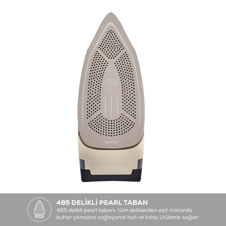 - کف مرواریدی با 485 سوراخ، بخار را بهطور یکنواخت از تمام منافذ خارج میکند و تماس بیشتری با لباس برقرار کرده و اتوکشی را سریعتر و آسانتر میکند.