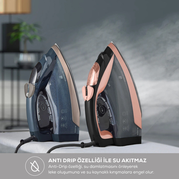 - ویژگی **Anti-Drip** از نشت آب از کفی جلوگیری کرده و مانع ایجاد لکه روی پارچه در حین اتوکشی میشود.