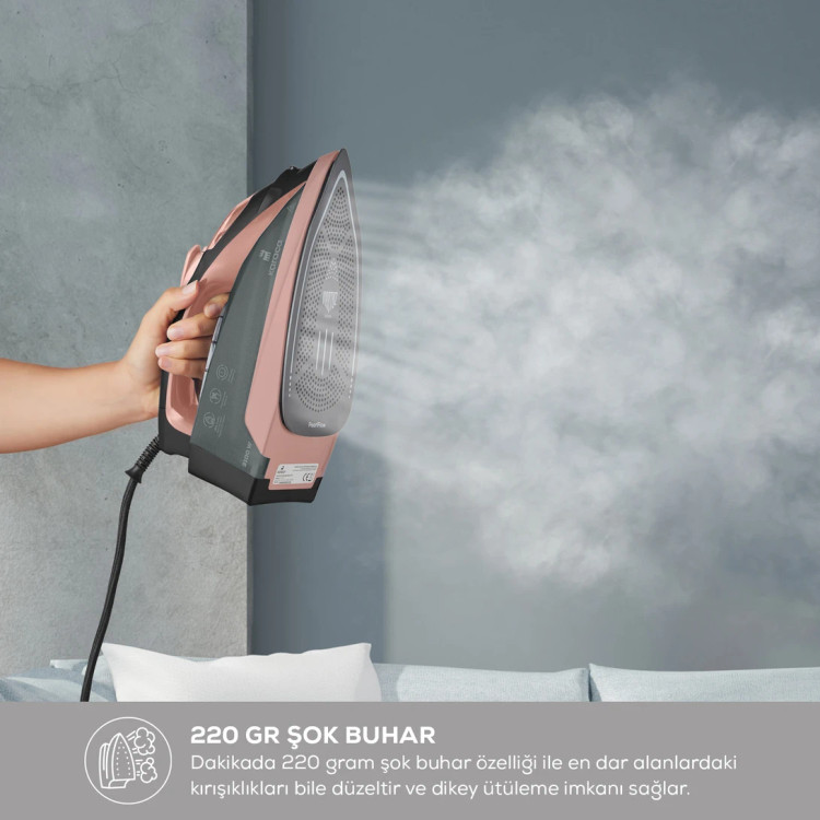 - قابلیت بخاردهی لحظهای 220 گرم در دقیقه، سرسختترین چروکها را از بین میبرد و امکان اتوکشی عمودی مؤثر را فراهم میکند.