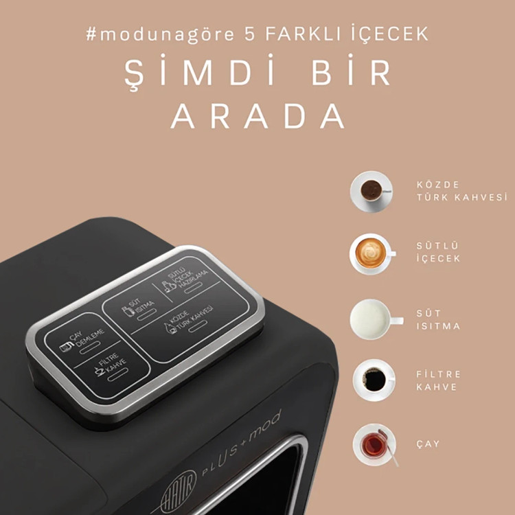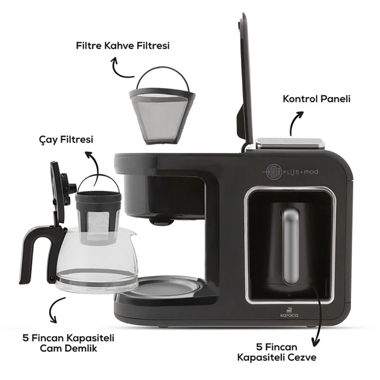 با Karaca Hatır Plus Mod میتوانید بر اساس سلیقه و نیاز خود، قهوه فیلتری، چای، گرم کردن شیر، تهیه نوشیدنیهای شیری و قهوه ترک با طعم ذغالی را آماده کنید.