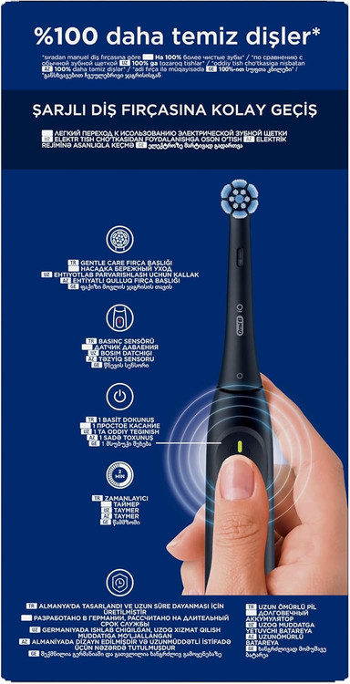 مسواک دارای فناوری **Oral-B iO** در مقایسه با مسواک دستی معمولی، ۱۰۰٪ پلاک بیشتری را از بین میبرد: مؤثر در برابر پلاکها، ملایم برای لثهها.
