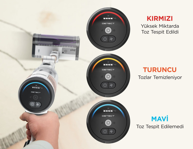 زمانی که نشانگر LED آبی است، این نشان میدهد که سطح زمین کثیفی معمولی دارد و قدرت مکش نیز در حد طبیعی است. زمانی که جاروبرقی آلودگیها و گرد و خاک سنگین را شناسایی کند، چراغ LED قرمز میشود و قدرت مکش افزایش مییابد. زمانی که نشانگر LED زرد باشد، نشان میدهد که کثیفی و آلودگیها تمیز شدهاند. فرآیند جاروکشی باید تا زمانی که چراغ LED آبی شود ادامه یابد.